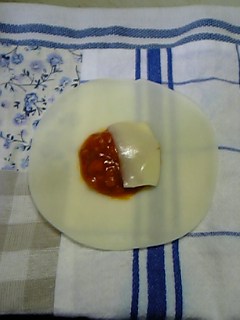 1・餃子の皮にほんの少しのミートソース(水分をかなりとばしてから)と、小さく切ったとろけるチーズをのせます。