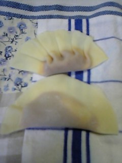2・皮の端を水をつけ包みます。(しっかりつけないと揚げたときにソースが出てきてはねるので危ないです^^;)